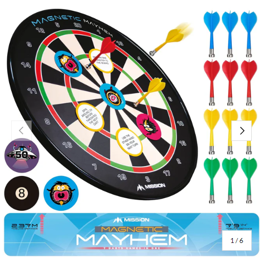 Seven games in one board: Will you feed your alien, smash the spaceship, pot the ball, or dash from the dinosaur? This kit comes with 102 magnetic pieces (in 6 sets) to transform the traditional dartboard into six brilliant fun games. Priced at £19.95