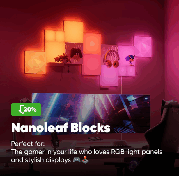 Nanoleaf Blocks:3D modular panels that double as wall art, syncing to playlists, games, or mood lighting. They can add peg boards and shelves to make their gaming and workspaces more fun and functional.