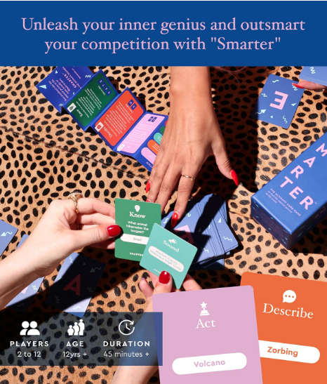 The goal? Collect cards that spell SMARTER before the other team does. It’s part Articulate, part Trivial Pursuit, part Charades, and